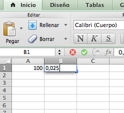 Ahora vamos a colocar en la celda A1 el valor inicial o valor de la compra, pero como el ejercicio no nos lo da ya que esto es lo que se esta buscando, digitaremos un valor cualquiera que sera provisional, en nuestro caso colocaremos 100 y en la celda B1 colocaremos la tasa de interés