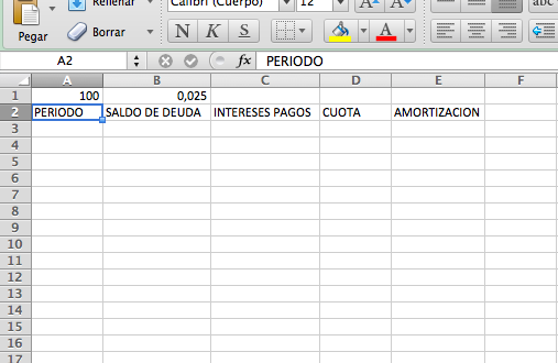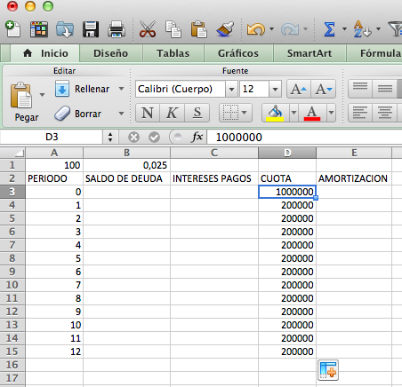 Ahora bien a diferencia de otros ejercicios de tablas de amortizaciòn elaborados en la página, comenzaremos a formular desde la columna "cuota", ya que si observamos en este ejercicio tenemos una cuota inicial de 1000000, la cual debemos incluir en el período 0 y al mismo tiempo tenemos 12 cuotas mensuales de 200000 pesos que iran desde el período 1 hasta el período 12