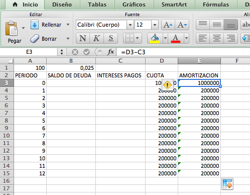 Ahora vamos a formular la columna de amortización, donde amortización será igual a cuota menos intereses pagos, empezando desde el período cero ya que tenemos una cuota inicial, es decir formulamos en la celda E3: =D3-C3 y arrastramos hasta la celda E15