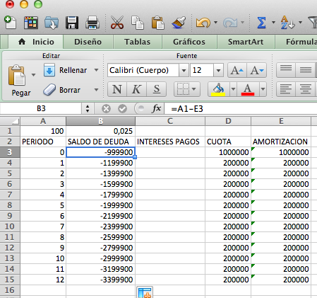 En saldo de deuda vamos a formular, en primer lugar en la celda B3 tendremos que al valor de la compra restarle la amortización generada por la cuota inicial, quedaria entonces en B3: =A1-E3 , y luego a partir del período 1 hasta el período 12 formularemos el saldo de deuda del período anterior menos la amortización, es decir en la celda B4 formulamos =B3-E4 y arrastramos hasta la celda B15
