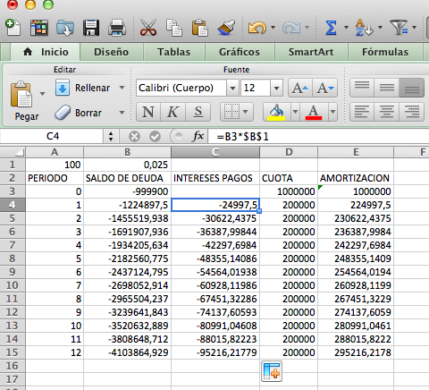 Finalmente formularemos la columa de intereses pagos, en la celda C4 formularemos =B3*$B$1 y arrastramos hasta la celda C15, es decir el saldo de deuda por la tasa de interés es fija a partir del período 1 hasta el período 12