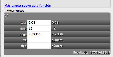 Nos falta ingresar un dato, el de la cuota inicial, el cual no lo podemos ingresar en el cuadro de la fòrmula por lo tanto tenemos que sumarlo después del parentesis