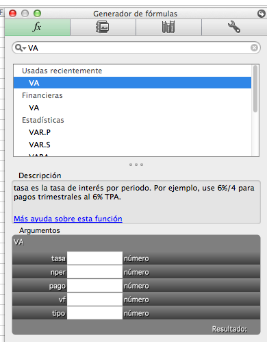 Para los ejercicios de anualidades que se necesite conocer el valor inicial o actual, necesitaremos la funcion VA en EXCEL , entonces en en "Buscar una función" digitamos VA, la seleccionamos y nos aparecerá el siguiente cuadro de diálogo donde debemos incluir los datos de nuestro ejercicio